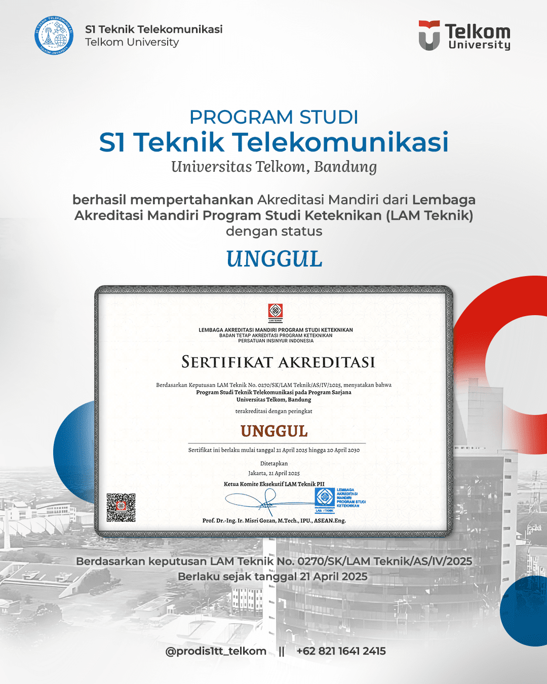 Program Studi S1 Teknik Telekomunikasi Fakultas Teknik Elektro Universitas Telkom kembali meraih Akreditasi Unggul berdasarkan keputusan LAM Teknik No. 0270/SK/LAM Teknik/AS/IV/2025. Akreditasi ini berlaku mulai tahun 2025 hingga tahun 2030, menegaskan komitmen kami dalam menjaga kualitas pendidikan dan pengembangan sumber daya manusia di bidang teknik telekomunikasi. Terima kasih kepada seluruh civitas akademika, dosen, staf, dan […]