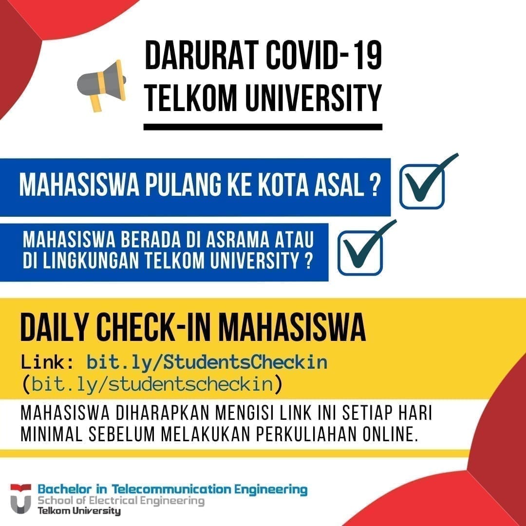 Selamat siang. Menanggapi edaran rektor No:045/SKR4/REK/2020 Tentang Keadaan Status Keadaan Darurat COVID-19 di Lingkungan Telkom University, mohon kiranya agar mahasiswa wali bapak/ibu mengisi link berikut, baik bagi mereka yg pulang ke kota asal ataupun yang tetap tinggal d asrama atau lingkungan sekitar kampus Telkom University.