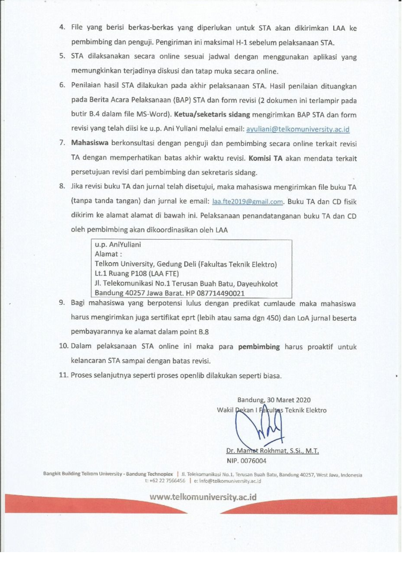 Merujuk pada Petunjuk Teknis Pelaksanaan Kegiatan Akademik selama Keadaan Darurat Covid-19 di Lingkungan Telkom University Nomor: 008/AKD02/UAA/2020, dengan ini kami sampaikan arahan pelaksanaan bimbingan dan Sidang Tugas Akhir di lingkungan Fakultas Teknik ElektroUniversitas Telkom.