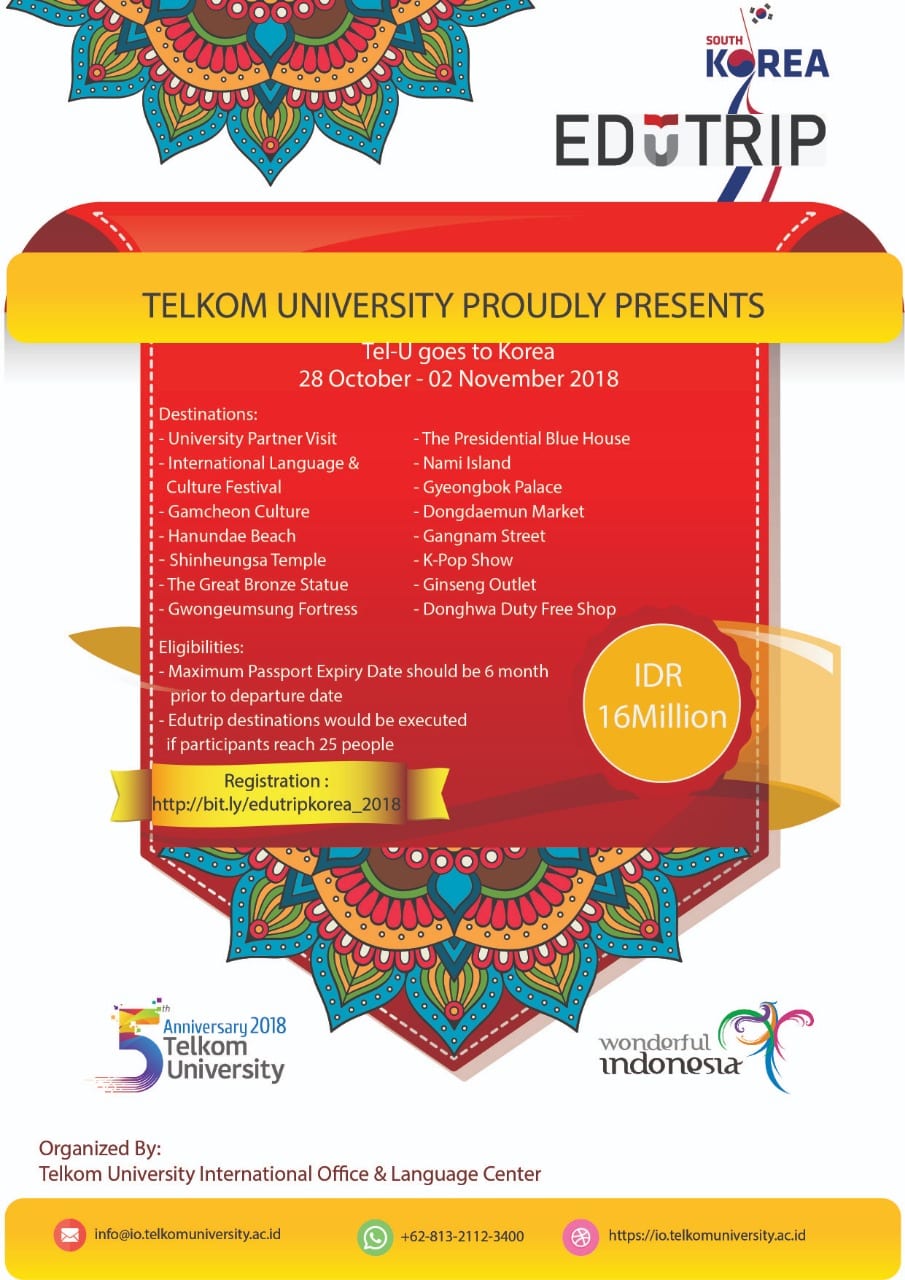 We invite students / staffs of the telkom university to join Edutrip Road to South Korea 2018