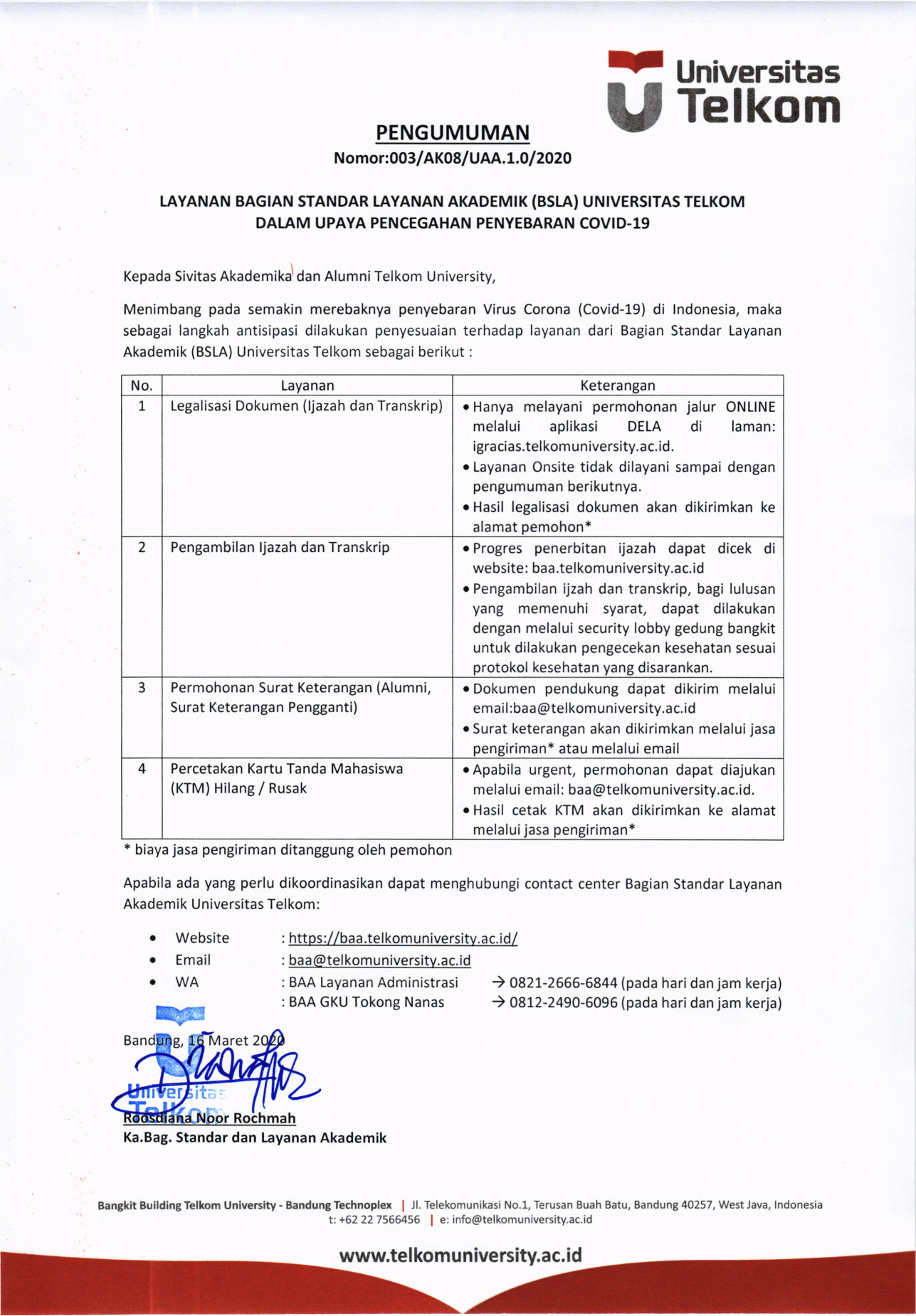 Menindaklanjuti SURAT EDARAN No: 040/SKR4{RER|2A2O TENTANG ANTISIPASI PENYEBARAN CORONA VIRUS DISEASE (COVID-19) Dl LINGKUNGAN TELKOM UNIVERSITY, maka dilakukan penyesuaian terhadap Layanan Administrasi Akademik (LAA) Fakultas Teknik Elektro dan BSLA Universitas Telkom sebagai berikut: