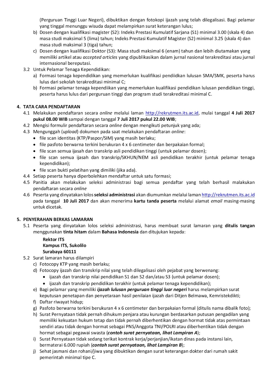 - Pengumuman yang berkaitan dengan kelulusan pada setiap tahap seleksi hanya dilakukan melalui laman http://rekrutmen.its.ac.id dan laman http://www.its.ac.id (tidak ada proses surat-menyurat).