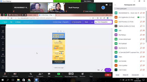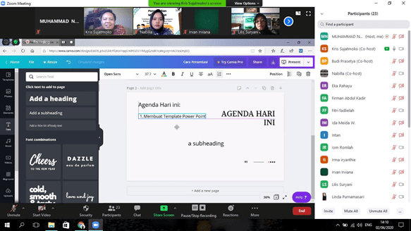 oleh karena itu, pada tanggal 2-3 juni 2020 dilaksanakan pengabdian oleh TIm Dosen Telkom Uniersity. Pada pengabdian masyarakat kali ini akan diberikan pelatihan pembuatan materi presentasi pengajaran menggunakan perangkat lunak Microsoft Power Point, Template menggunakan Canva.com yang lebih optimal, terutama kemampuan penggunaan multimedia dan animasi di dalam presentasi. Diharapkan presentasi yang dibuat lebih baik, menarik dan lebih efektif digunakan dalam proses belajar mengajar.