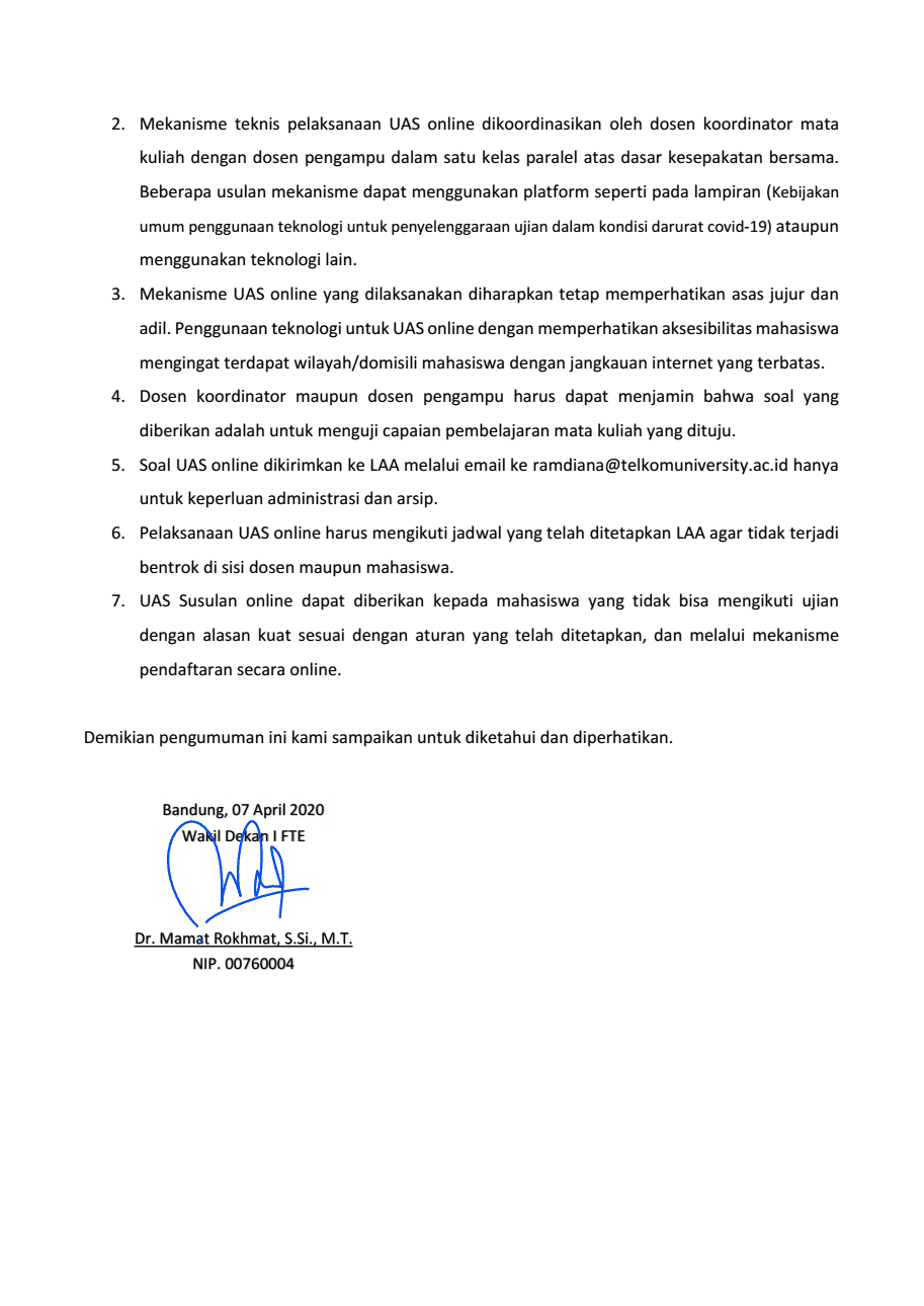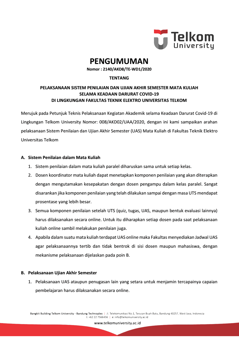 Merujuk pada Petunjuk Teknis Pelaksanaan Kegiatan Akademik selama Keadaan Darurat Covid-19 di Lingkungan Telkom University Nomor: 008/AKD02/UAA/2020, dengan ini kami sampaikan arahan pelaksanaan Sistem Penilaian dan Ujian Akhir Semester (UAS) Mata Kuliah di Fakultas Teknik Elektro Universitas Telkom. berikut edarannya.