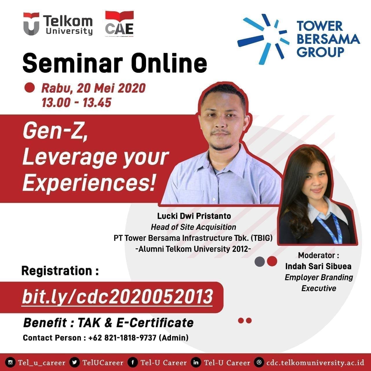 Direktorat Pusat Pengembangan Karir, Alumni dan Endowment Telkom University akan mengadakan Seminar Karir Online TBIG X TELU CAE dengan tema “Gen-Z, Leverage your Experience” yang akan diselenggarakan pada: