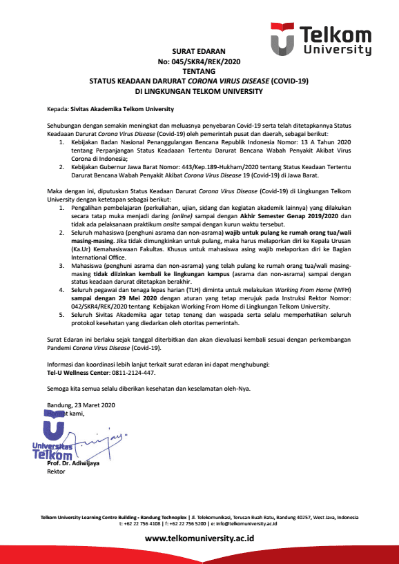 Sehubungan dengan semakin meningkat dan meluasnya penyebaran Covid-19 serta telah ditetapkannya Status Keadaaan Darurat Corona Virus Disease (Covid-19) oleh pemerintah pusat dan daerah, sebagai berikut: