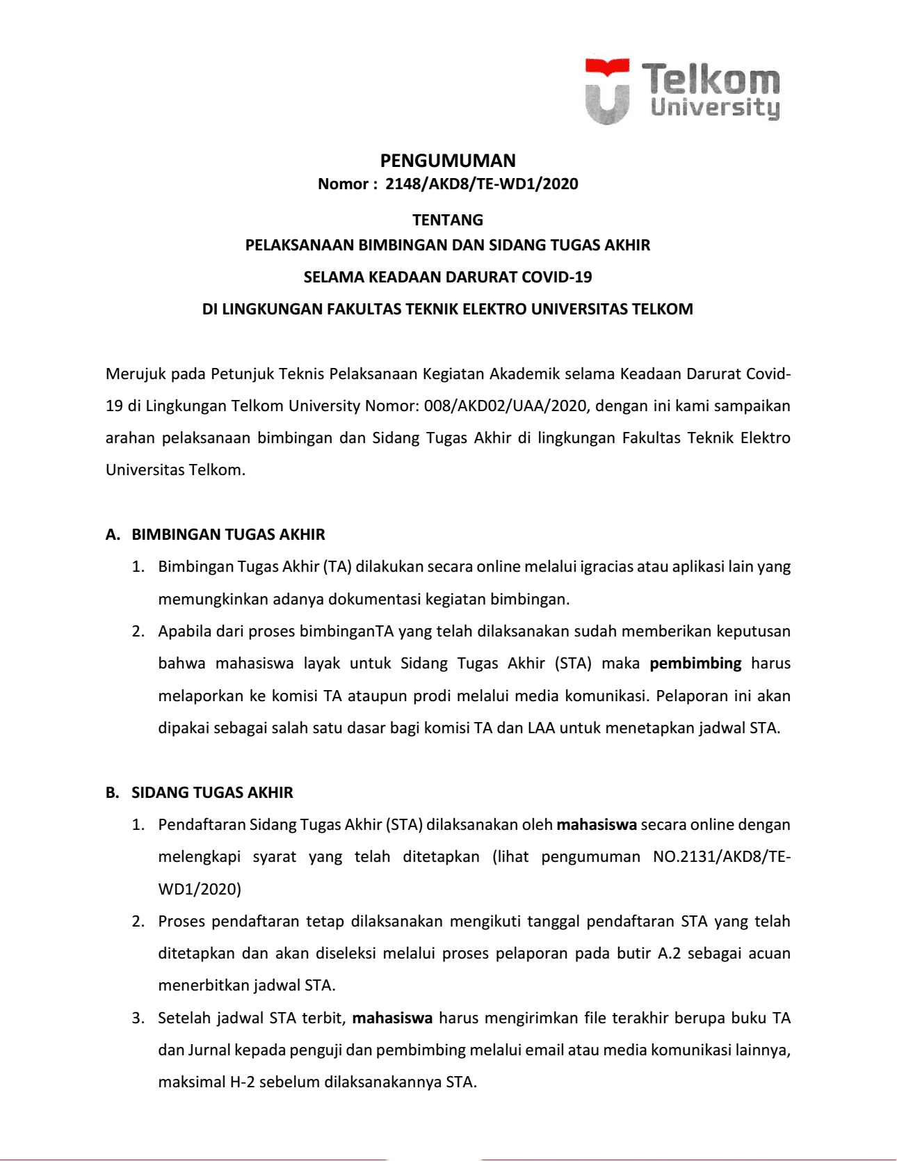 Merujuk pada Petunjuk Teknis Pelaksanaan Kegiatan Akademik selama Keadaan Darurat Covid-19 di Lingkungan Telkom University Nomor: 008/AKD02/UAA/2020, dengan ini kami sampaikan arahan pelaksanaan bimbingan dan Sidang Tugas Akhir di lingkungan Fakultas Teknik Elektro Universitas Telkom